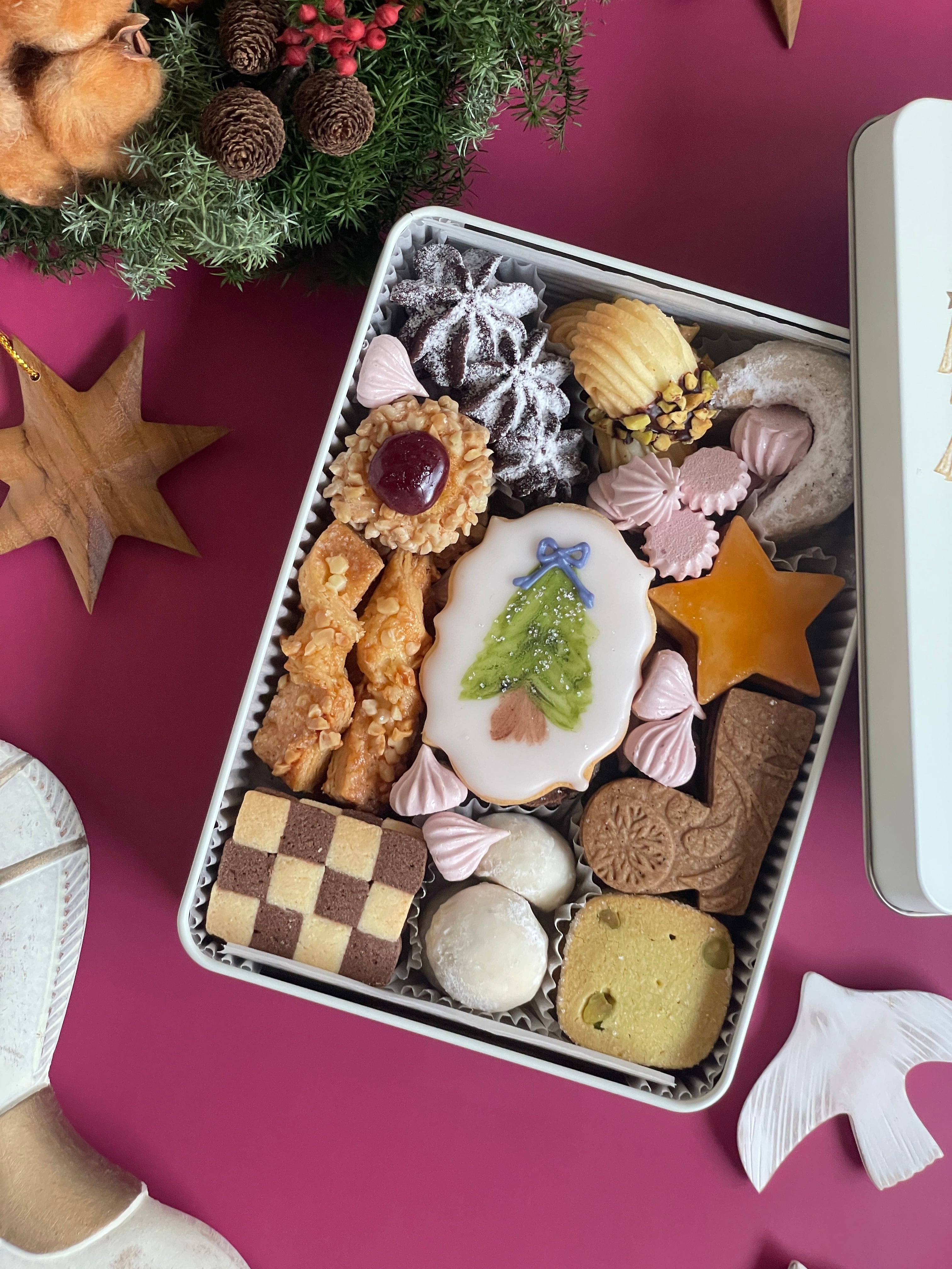 ひとつひとつ手書きで描いたツリーのアイシングクッキーを中心に、